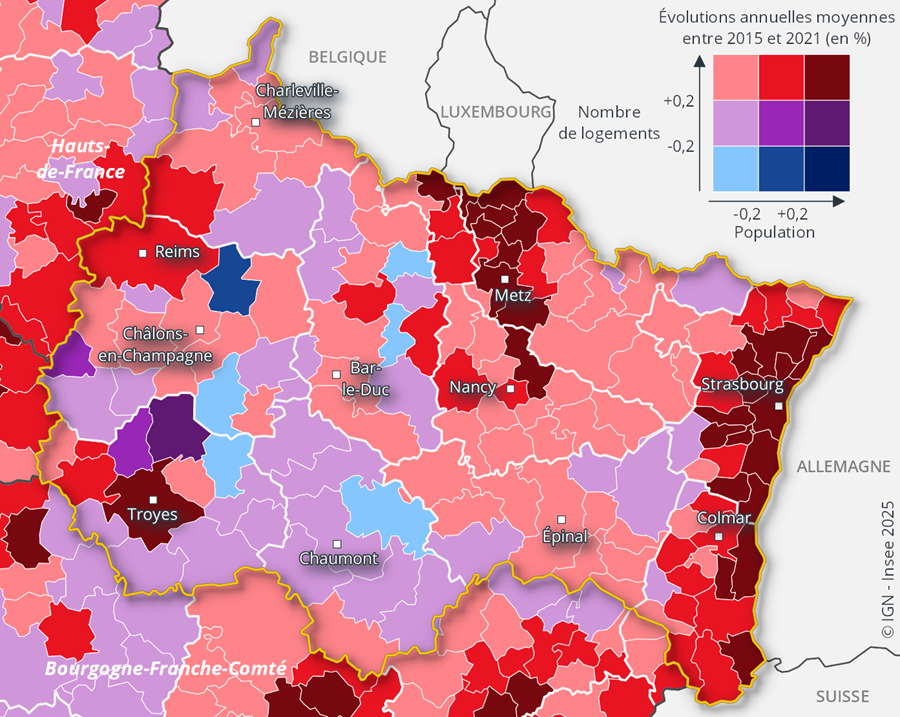 tableauLa population stagne dans le Grand EstÉvolution annuelle moyenne de population entre 2016 et 2022