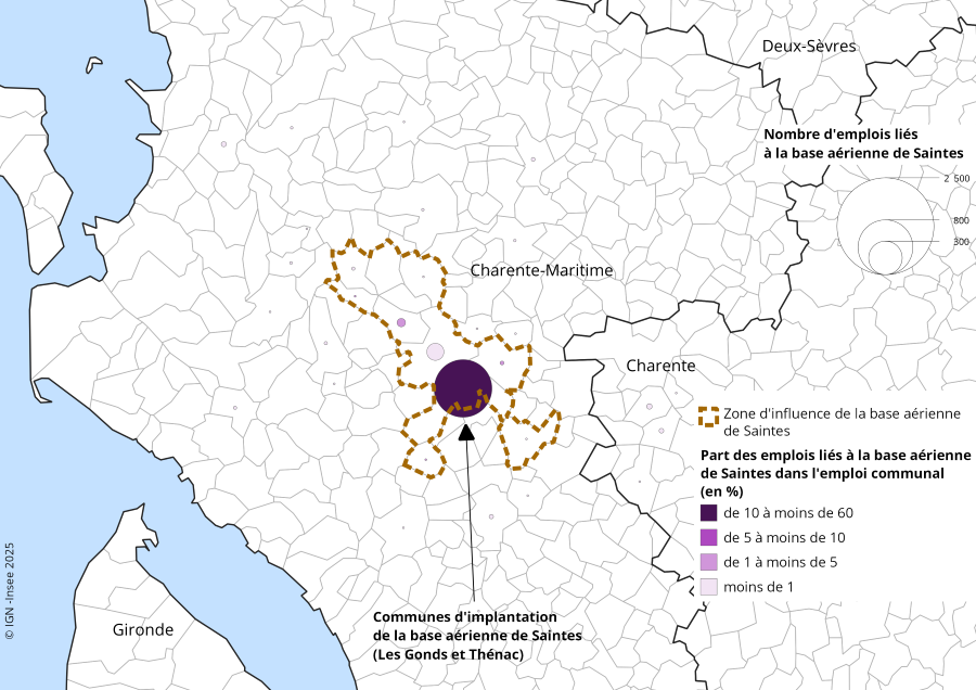 - Lecture : En 2023, 890 emplois liés à la base aérienne de Saintes se situent dans les communes d’implantation de la base (Les Gonds et Thénac), soit 56 % des emplois de ces communes réunies.