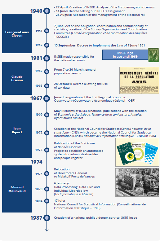 By tracing the development of INSEE and the Official Statistical Service from its creation until the mid-1980s (Figure), we aim to clarify the extent to which this statistical system fulfils this mission of producing and disseminating statistical information and how it feeds into the social and political debate. These first forty years are divided into two periods, during which the audience for INSEE’s work and its contribution to democratic debate were growing. Of course, the boundaries between the two periods are blurred, with no abrupt break in the story. As Amossé et al. wrote in their historical analysis of men and women in household statistics: “Our article is therefore presented more like the draft of a historical reading put forward for discussion than an actual work by a statistical historian”.