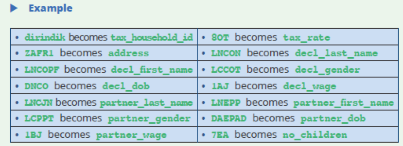 In order to use variables from an administrative source, it is easier when they have a name that can be understood (for example: decl_wage) rather than retaining the name in the original file that corresponds to the name of the box in the tax form (1AJ) in this example.