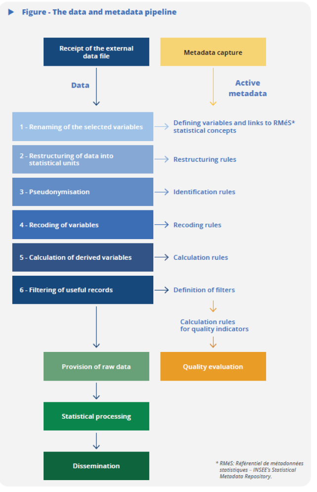 The aim of this industrialisation is to establish a sequence of generic, customizable processing activities that are as independent as possible from the input source. Integrating a new source (or updating an existing source) is therefore a case of describing the input source, the desired output data model and the transformations required in order to turn one into the other. The data integration step sequence then takes place automatically based on these metadata, which become active metadata. As a result, by specifying the expected representation of a variable (M, F for the gender variable, for example), it is possible to automatically generate value-checking processing activities.