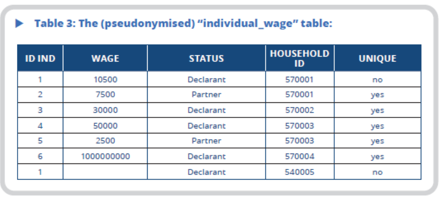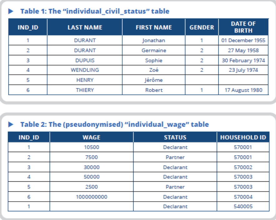 The implementation of such pseudonymisation in our example results in the table of individuals being bisected, with one table called “individual_civil_status”, which contains civil status data, and the second called “individual_wage”, which contains the other variables. The two tables are linked using the variable ind_id, which uniquely identifies an individual based on their last name, first name and date of birth. As can be seen, the “individual_civil_status” table only contains six rows, as Jonathan Durant is duplicated within the file.