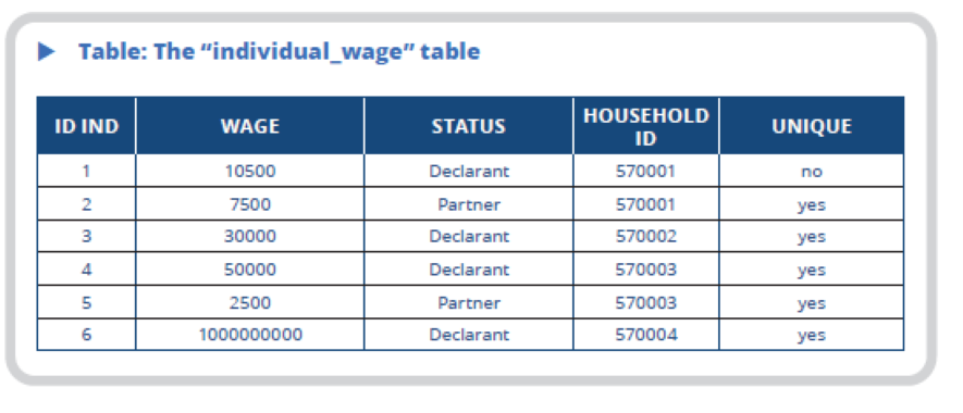 In the example, the rows of duplicate individuals with a missing wage value are not of interest. The unique variable is recalculated based on this new table.