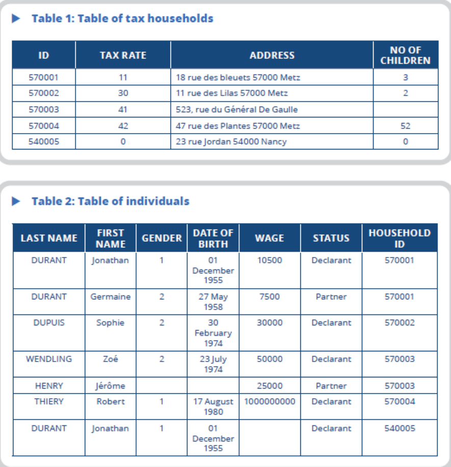Conversely, it may be desirable to break a record within the input file down into several records in the statistical data model (this is the case for individuals within the tax files, which are structured as tax households). It then becomes necessary to explain the links between different statistical units. In the context of tax data, establishing this link between individuals and tax households on the one hand, and tax households and addresses on the other hand, ultimately allows us to create households.