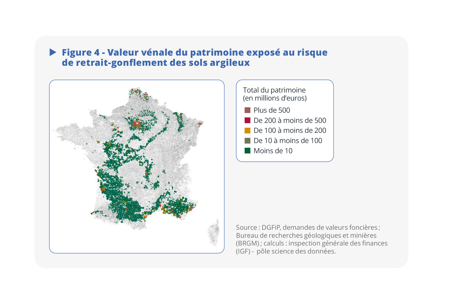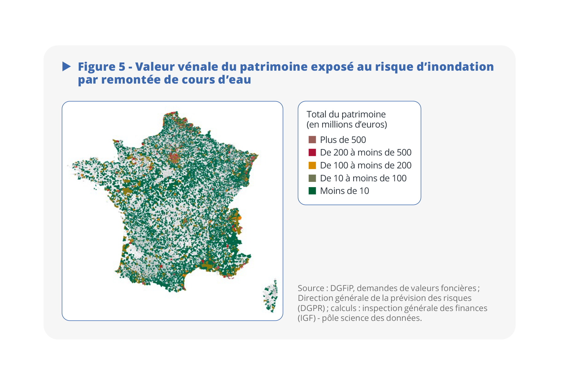 La méthode permet de s’intéresser spécifiquement à l’exposition à certains risques (figure 4 et figure 5). Par exemple, 15 % des bâtiments des collectivités territoriales sont à risque fort de retrait-gonflement des sols argileux, pour une valeur vénale de 61 Md€ (soit 14 % du patrimoine bâti) ; les bâtiments les plus exposés à ce risque et les plus chers sont concentrés en Île-de-France et autour de la Méditerranée. De même, 31 % des bâtiments se trouvent dans des zones à risque d’inondation par remontée de cours d’eau au sens de l’EAIP (162 Md€, soit 38 % du patrimoine bâti).