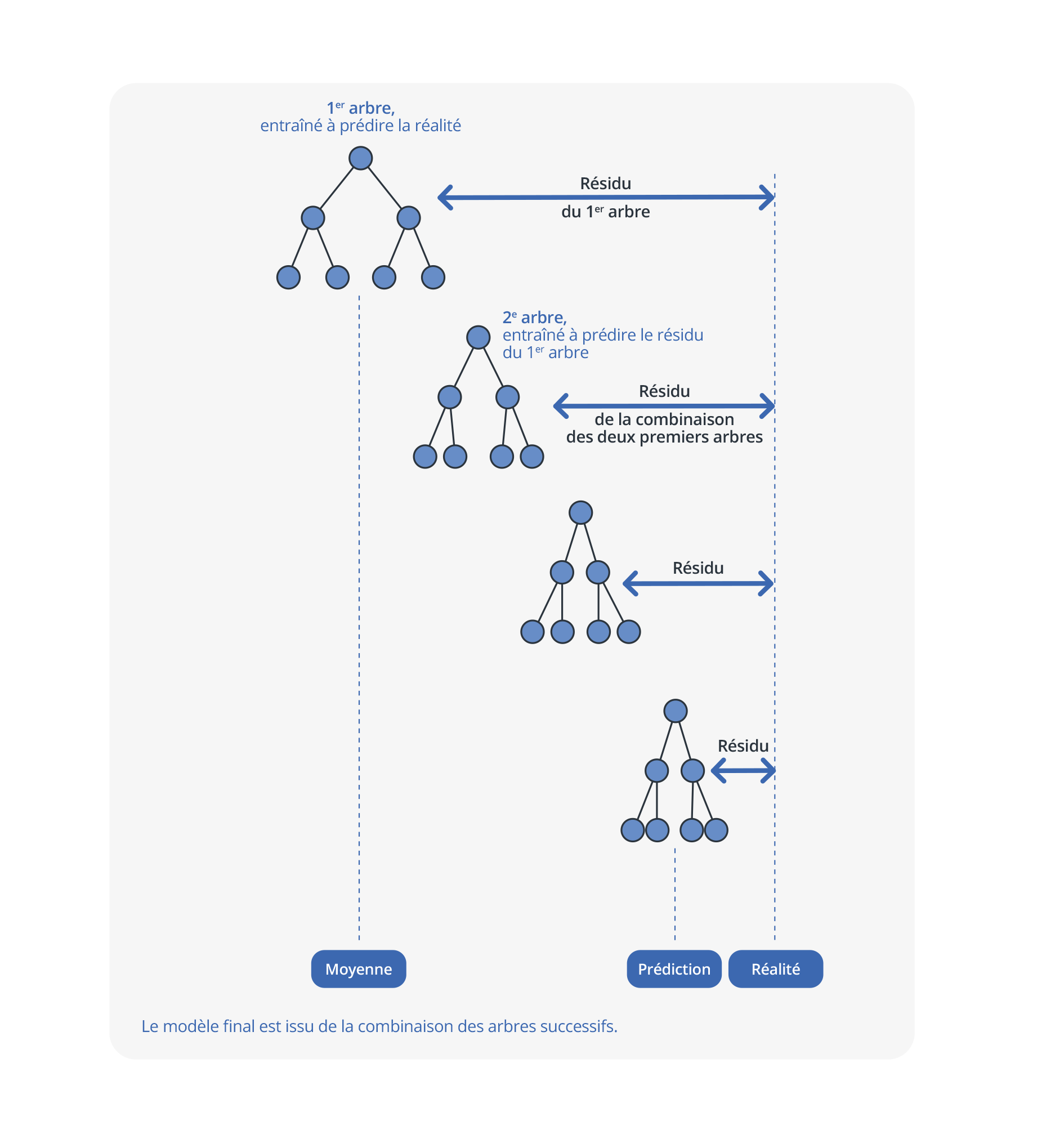 L’algorithme d’entraînement combine les prédictions de nombreux modèles simples pour créer un modèle plus puissant. Pour réaliser cette combinaison, il emploie des méthodes dites de boosting (Ouvrir dans un nouvel ongletFreund et Schapire, 1996), c’est-à-dire que le modèle apprend en construisant itérativement des arbres de décision, chaque arbre étant entraîné à prédire les erreurs de prédiction des arbres précédents combinés (figure encadré).