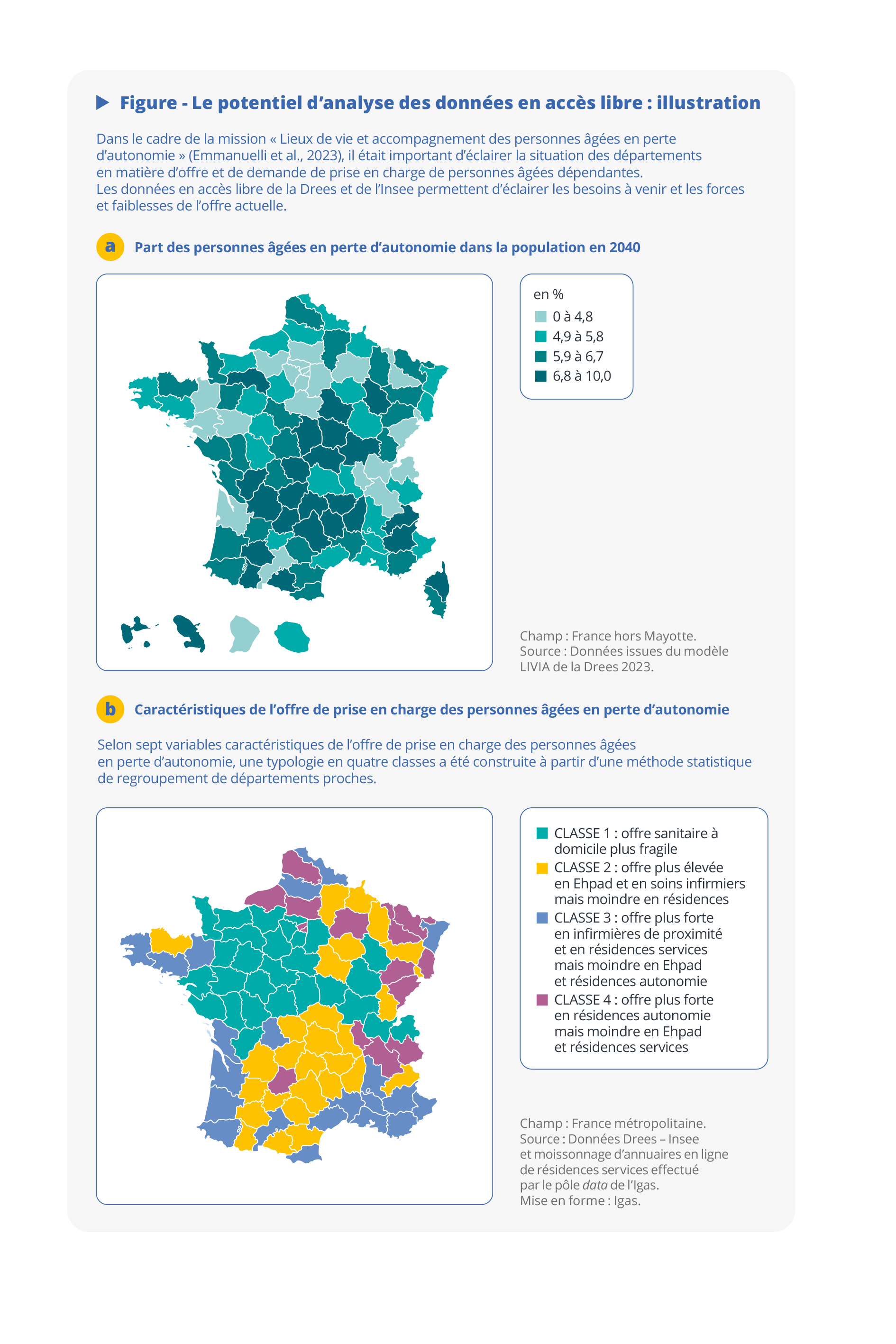 - d’un côté, les données en accès libre ont permis de décrire comment les personnes âgées dépendantes se répartissent dans les départements, quelle part elles représentent dans la population totale de chaque département et comment la situation est susceptible d’évoluer à l’horizon 2030 ou 2040 ;