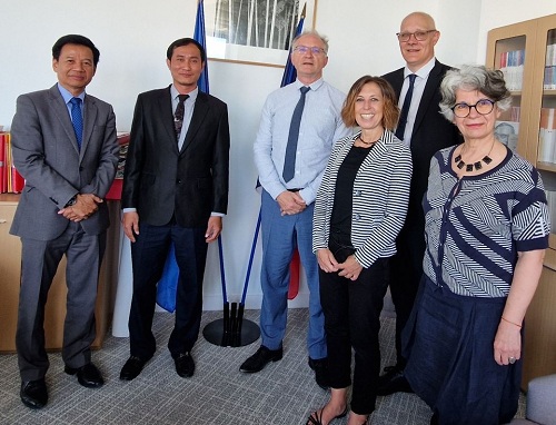 De gauche à droite : M. Lay Chhan, Directeur général adjoint du NIS, HE Try Ritthea, Directeur général du NIS, Jean-Luc Tavernier, Directeur général de l’Insee, Oriana Daniele, conseillère résidente du jumelage avec le NIS, Olivier Biau, chef du département Coordination statistique et internationale et Dominique Francoz, responsable de la composante gouvernance du jumelage avec le NIS (Insee)