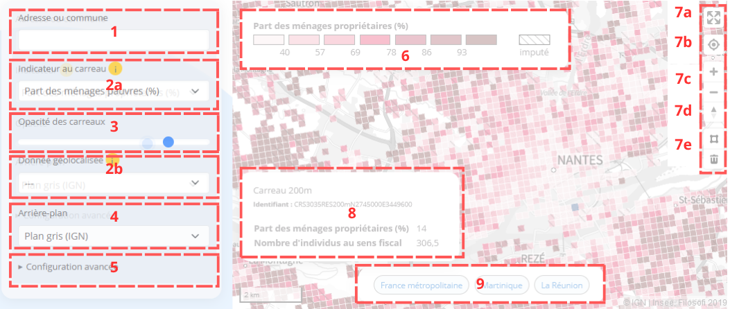 Au clic, ou lors d'une sélection, les informations du ou des territoires sont restituées dans la zone (8). Si aucune sélection n'est faite et qu'un indicateur est sélectionné, le niveau géographique de restitution est affiché (200m, 1km ou 20km).