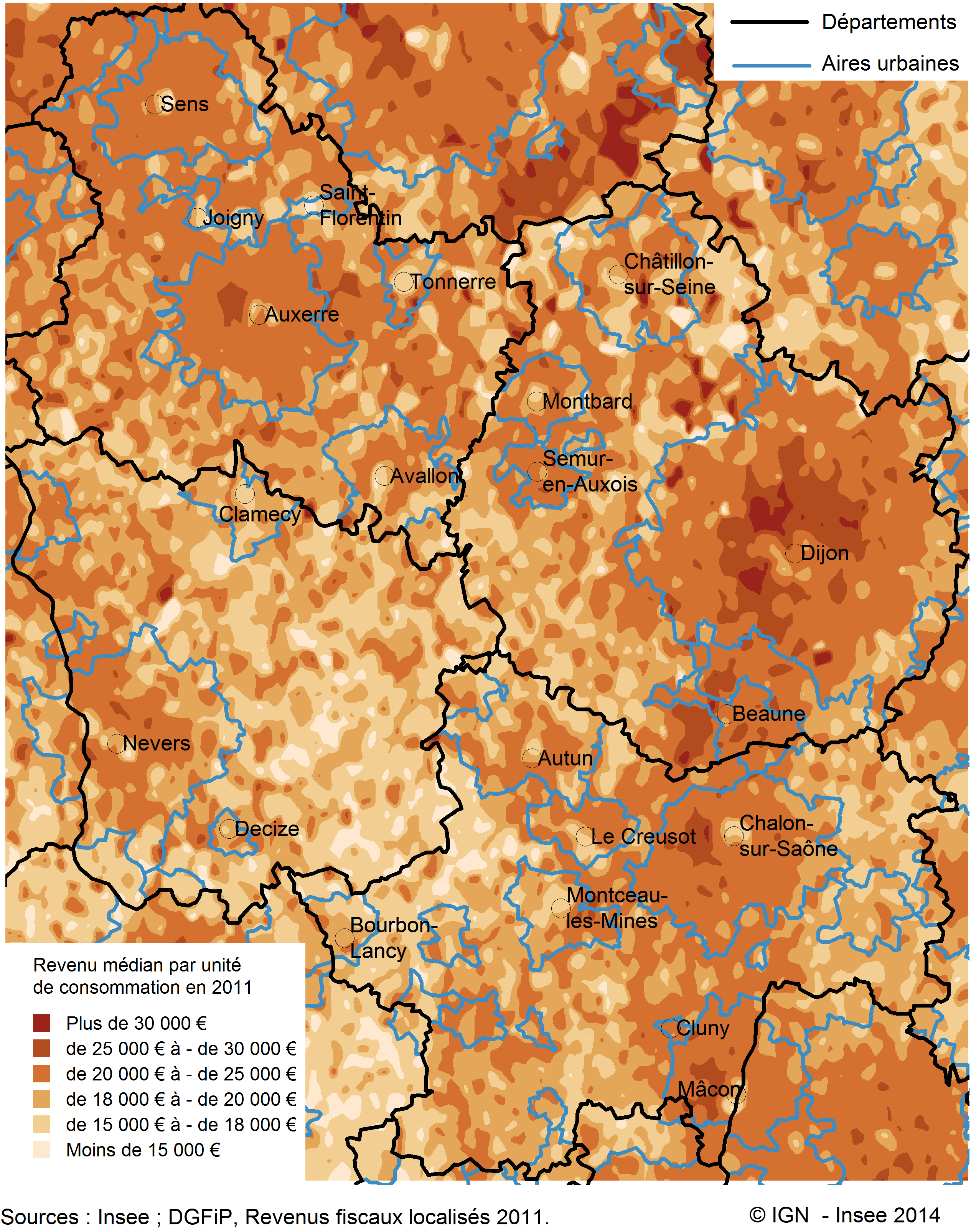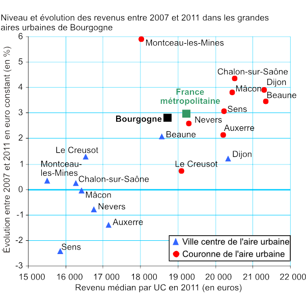 En revanche, les évolutions sont plus contrastées pour les villes-centre : Sens, Auxerre et Nevers s’appauvrissent, les revenus de Chalon-sur-Saône, Mâcon et Montceau-les-Mines restent stables tandis que ceux de Dijon, Beaune et Le Creusot progressent.