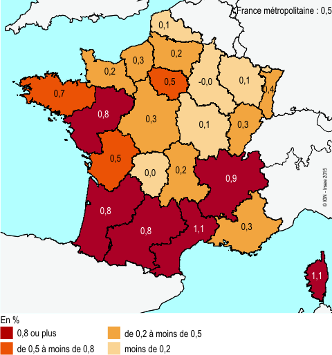 | France métropolitaine | 61 795 238 | 63 363 549 | /// | 551 700 | /// | 114,9 | 0,5 | 0,4 | 0,1 |