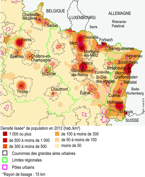 Dans les autres grandes aires urbaines que sont Troyes, Reims, Châlons-en-Champagne et Nancy, la population croît aussi (entre +0,4 % à Troyes et +0,1 % à Nancy), mais uniquement dans les couronnes périurbaines. Enfin, la population baisse (de -0,2 % à Verdun à -0,8 % à Sedan) dans les plus petites aires urbaines du centre et du sud du territoire (Verdun, Saverne, Bar-le-Duc, Saint-Dizier, Chaumont, Sedan), qui ne bénéficient pas de la proximité immédiate de grands pôles.