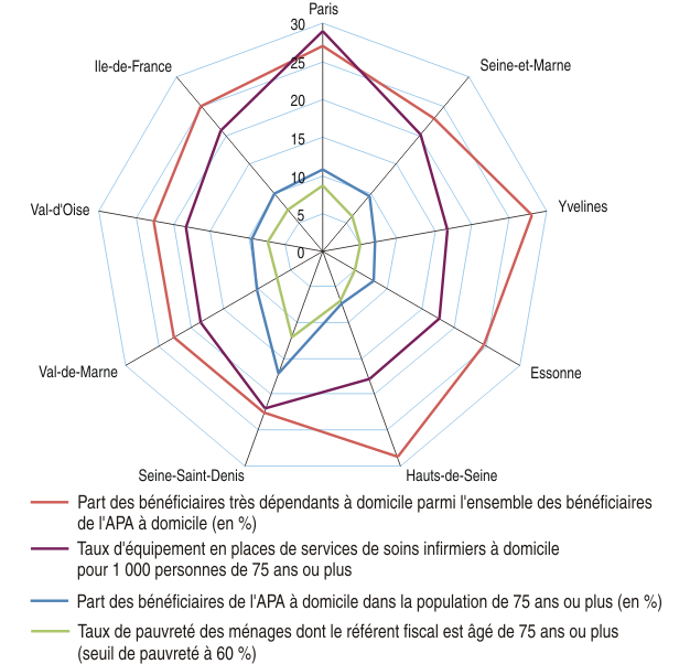 En 2013, 131 900 Franciliens bénéficient de l’Allocation personnalisée d’autonomie (APA) soit 17 300 bénéficiaires de plus qu’en 2008. L’Ile-de-France reste cependant la région de France métropolitaine où le taux de bénéficiaires de l’APA est le plus faible, pour des raisons démographiques et économiques. Au sein de la région, les départements où la part des bénéficiaires de l’APA est la plus importante sont ceux où le taux de pauvreté est le plus fort. Les bénéficiaires franciliens résident majoritairement à domicile.