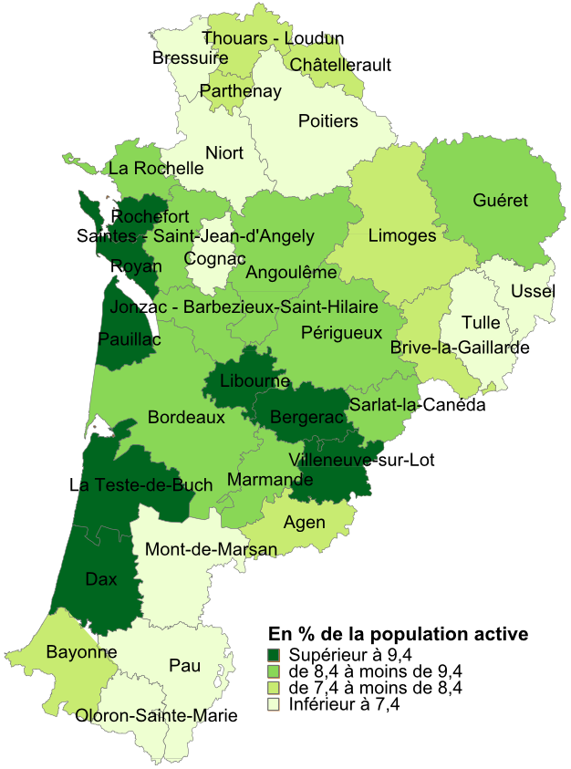Au 4e trimestre 2017, les zones d’emploi de Bressuire, Cognac, Mont-de-Marsan, Niort, Oloron-Sainte-Marie, Pau, Poitiers, Tulle et Ussel affichent les taux les plus faibles (figure 3). Le chômage est en repli entre 2016 et 2017 dans toutes les zones d’emploi de la région, et jusqu’à – 1,6 point pour la zone d’emploi de Bressuire.
