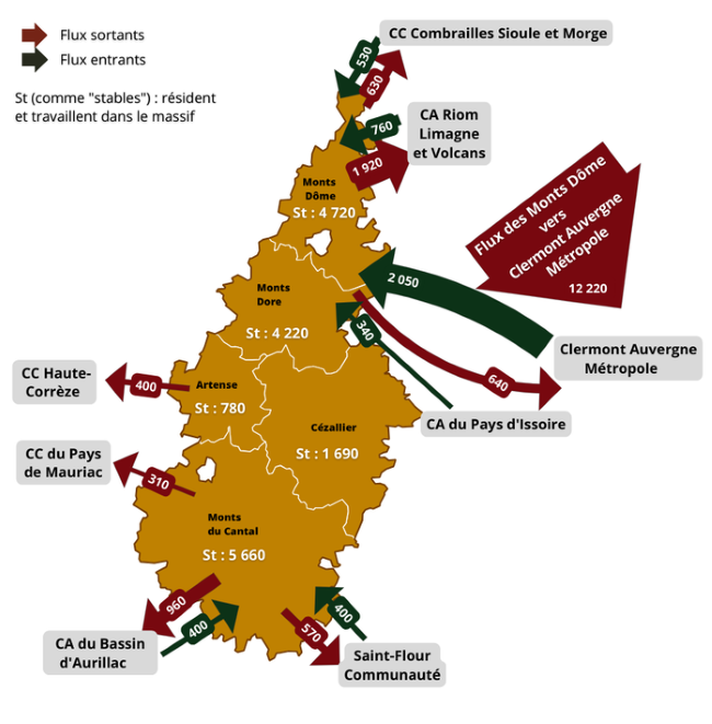 - Lecture : 12 220 personnes des Monts Dôme vont travailler dans Clermont Auvergne Métropole, 2 050 personnes résidant dans Clermont Auvergne Métropole vont travailler dans les Monts Dôme et 1 690 personnes du Cézallier restent travailler dans le massif (que ce soit dans leur commune de résidence ou une autre).