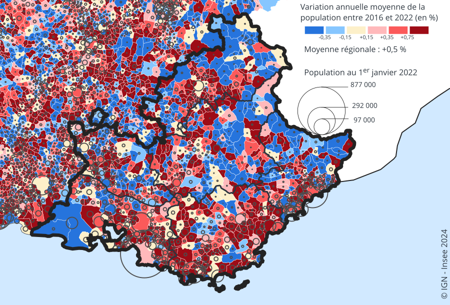 Au 1er janvier 2023, 5 219 000 personnes habitent en Provence‑Alpes‑Côte d’Azur. Entre 2017 et 2023, la population régionale augmente de 0,6 % en moyenne chaque année, un rythme légèrement supérieur au niveau national (+0,4 %). La croissance de la population repose presque entièrement sur le solde migratoire. Le Var, qui attire de nombreux nouveaux habitants, est le département le plus dynamique. Le taux de fécondité en Provence‑Alpes‑Côte d’Azur est le 2e plus élevé de France métropolitaine. Le vieillissement de la population y est toutefois très prononcé. Les personnes de 65 ans ou plus sont plus nombreuses que les jeunes de moins de 20 ans.