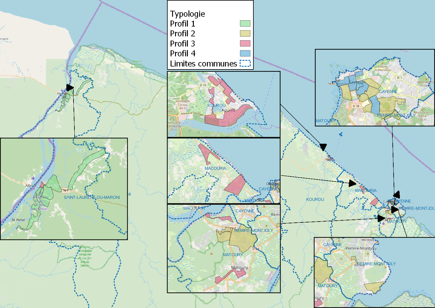 Ce dernier profil identifie les quartiers défavorisés proches du centre-ville de Cayenne. Il est composé de sept quartiers, tous situés à Cayenne et de taille modeste en termes de population.