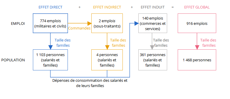 L’effet direct correspond à l’emploi salarié présent sur le site du régiment (militaire et civil). La population concernée par l’emploi direct correspond au nombre réel de personnes physiques.