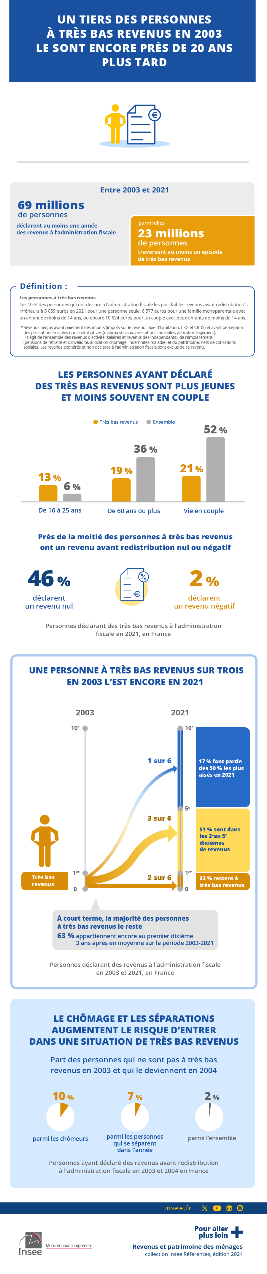 Parmi les personnes déclarant à l’administration fiscale des très bas revenus en 2003, un tiers sont encore dans cette situation en 2021. Sur des périodes plus courtes, la persistance dans le premier dixième de revenus est plus forte : 63 % des personnes du premier dixième une année donnée appartiennent encore à ce dixième trois ans après. La mobilité des personnes à très bas revenus vers les hauts revenus est très faible : seulement 3 % parviennent à se hisser parmi les 30 % les plus aisées trois ans après, et 8 % 18 ans après.