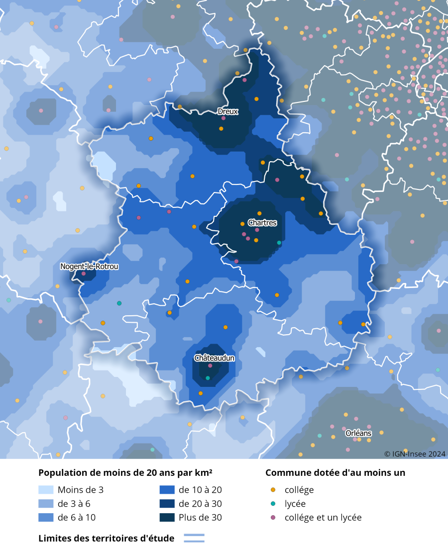 En 2021, l’Eure-et-Loir compte 107 000 jeunes de moins de 20 ans, soit près d’un habitant sur quatre à un âge proche de fréquenter les écoles ou les établissements du second degré. Cette population se concentre dans et autour des principales villes du département et aux limites de celui-ci avec l’Île-de-France. Elle diminue depuis la fin de la décennie 2010, notamment du fait du recul du nombre de naissances. Cette évolution concerne chacun des quatre territoires considérés dans le département. Dans l’hypothèse d’une poursuite des tendances actuelles, notamment en termes de solde migratoire et de natalité, la baisse de la population des moins de 20 ans devrait se prolonger à l’horizon 2040. Entre 2021 et 2040, le nombre d’habitants de moins de 20 ans diminuerait de 22 000.