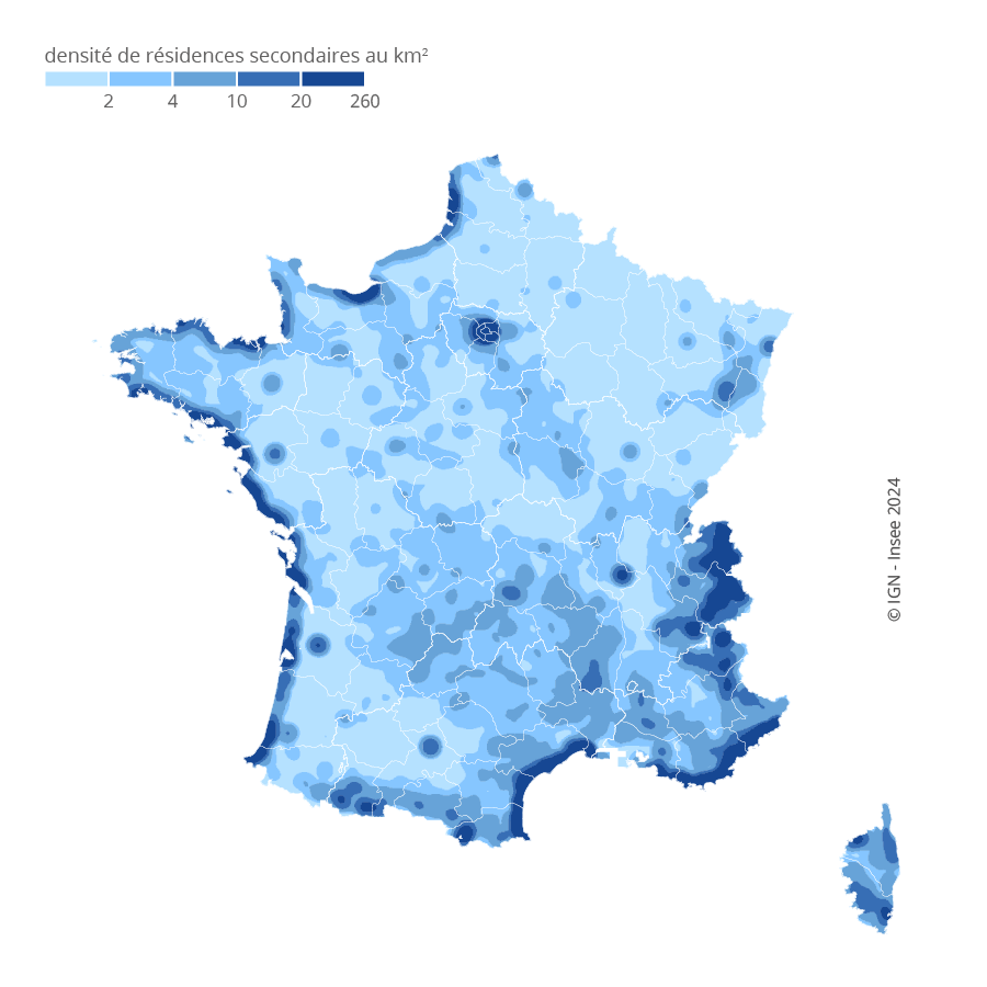 Pour la représentation du prix moyen au m² des maisons entre 2020 et 2022, le lissage est réalisé sur des carreaux de 1 km avec un rayon de lissage de 10 km. Pour celle de la densité communale en résidences secondaires en 2021, le lissage est réalisé sur des carreaux de 1 km avec un rayon de lissage de 20 km.
