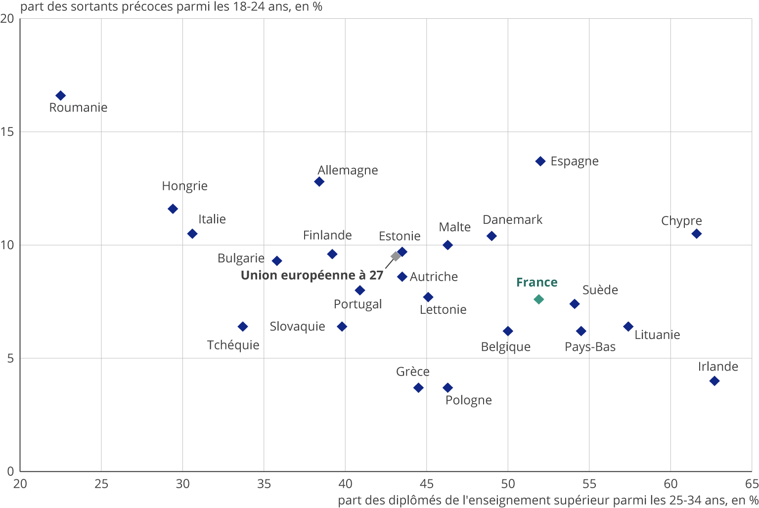 De façon générale, la part de diplômés de l’enseignement supérieur parmi les 25-34 ans varie en sens inverse de la part de sortants précoces parmi les 18-24 ans. Ainsi, l’Irlande comprend une grande part de diplômés de l’enseignement supérieur (63 %) et peu de sortants précoces (4 %) alors qu’à l’inverse, la Roumanie comprend une part relativement faible de diplômés du supérieur (23 %) et une part élevée de sortants précoces (17 %).