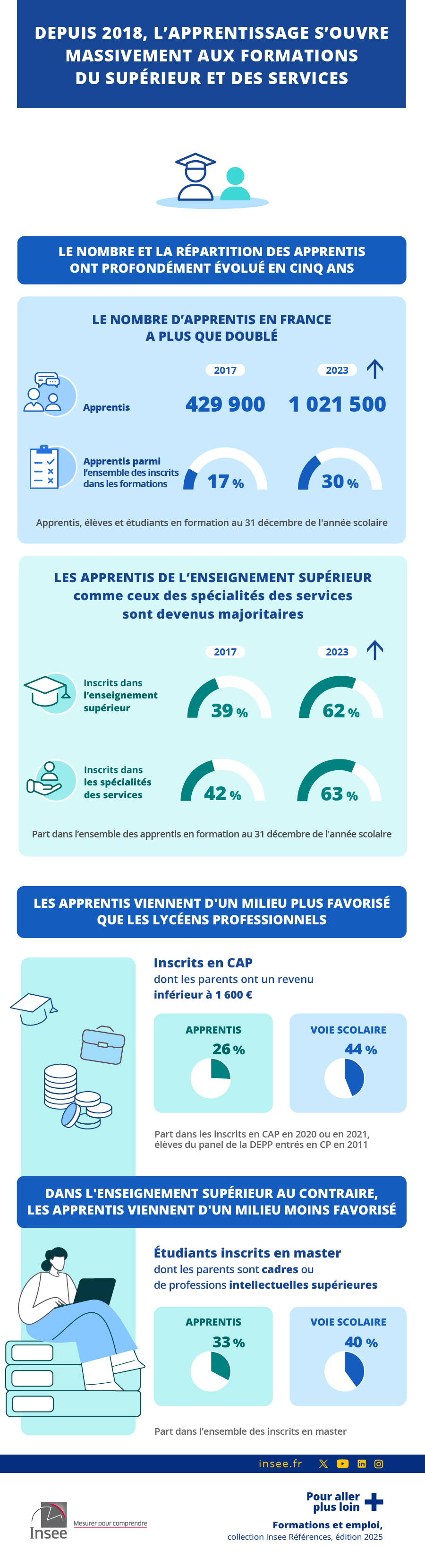 En six ans, le nombre d’apprentis du secondaire a été multiplié par 1,5, pour atteindre 385 600 en 2023. La hausse est plus marquée dans le supérieur : 635 800 jeunes y sont apprentis, 3,8 fois plus qu’en 2017. En conséquence, 62 % des apprentis préparent un diplôme du supérieur en 2023, contre 39 % en 2017.