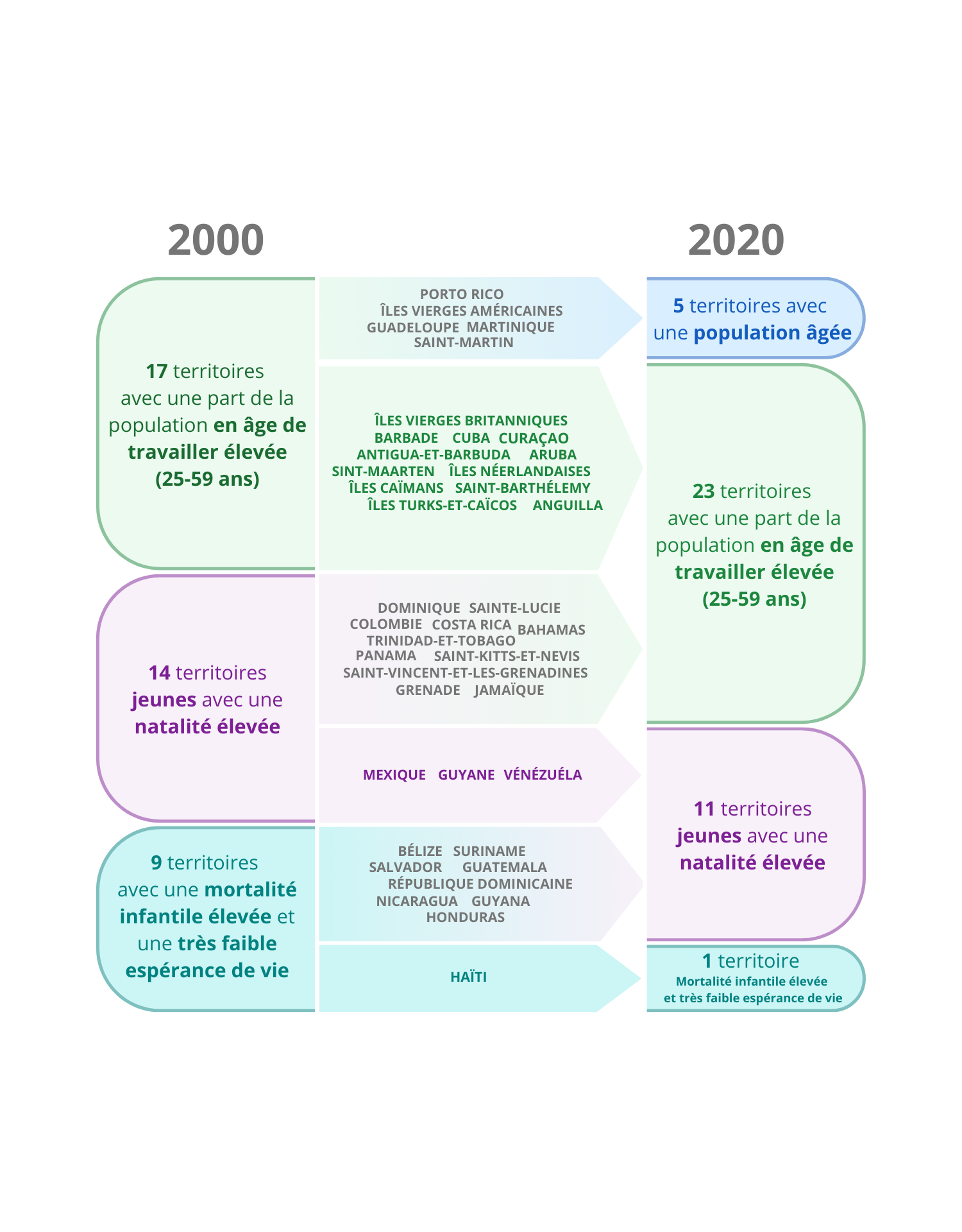 | Sainte-Lucie | Territoire jeune avec une natalité élevée | Territoire avec une part de population en âge de travailler élevée |