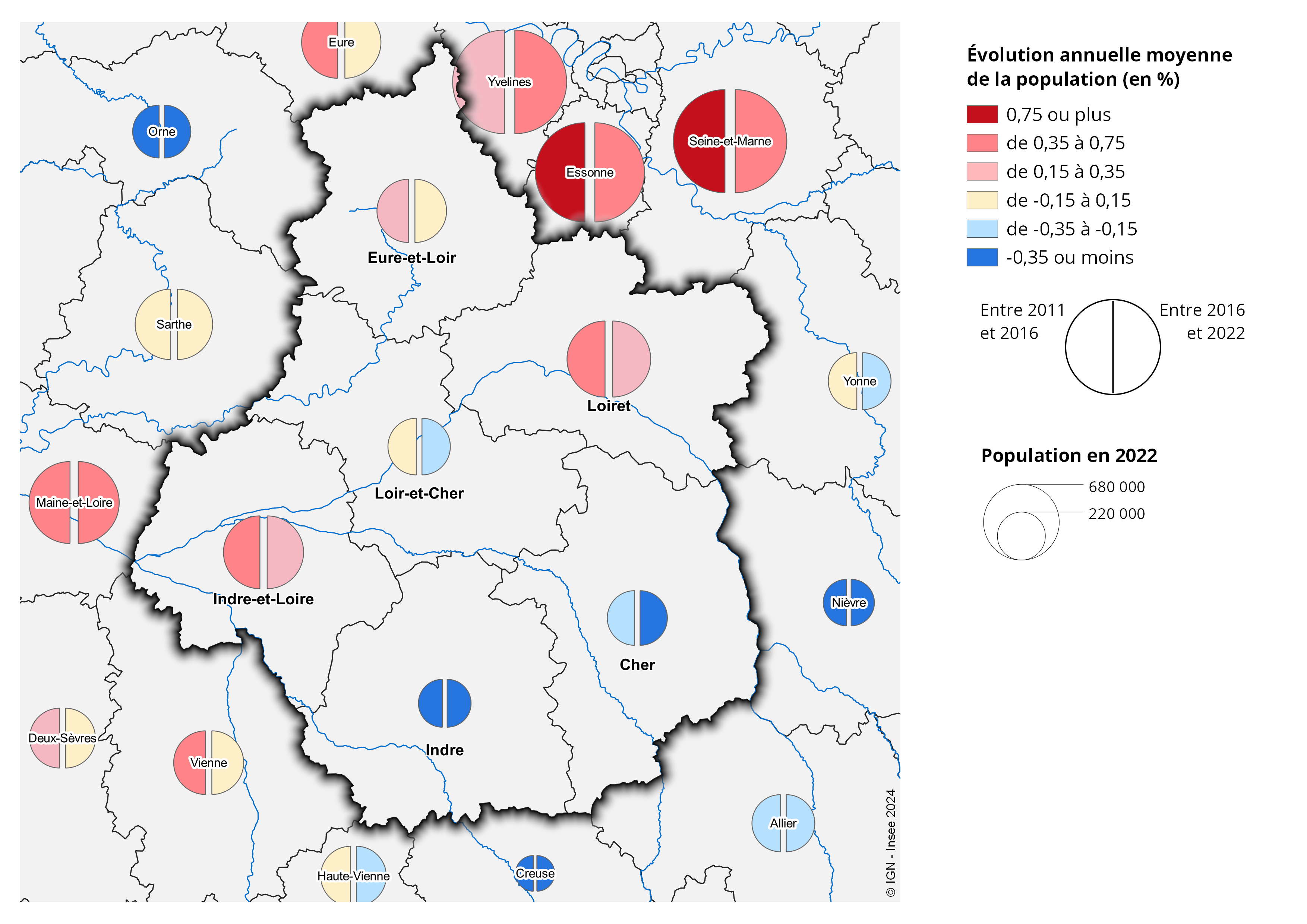 Entre 2016 et 2022, le nombre d’habitants de l’Eure‑et‑Loir est stable. L’excédent naturel compense le déficit migratoire. Le Loir‑et‑Cher perd 640 habitants par an. Le solde naturel négatif (-0,3 %) n’y est pas totalement compensé par un solde migratoire légèrement positif (+0,1 %). Dans le sud de la région, les populations du Cher et de l’Indre baissent à un rythme plus soutenu : respectivement -0,4 % et -0,5 % par an entre 2016 et 2022. Dans le Cher, le déficit naturel (-0,4 %) contribue à la baisse de la population et le solde migratoire est nul. Dans l’Indre, le solde migratoire est légèrement positif (+0,1 %), sans compenser un solde naturel fortement négatif (-0,6 %).