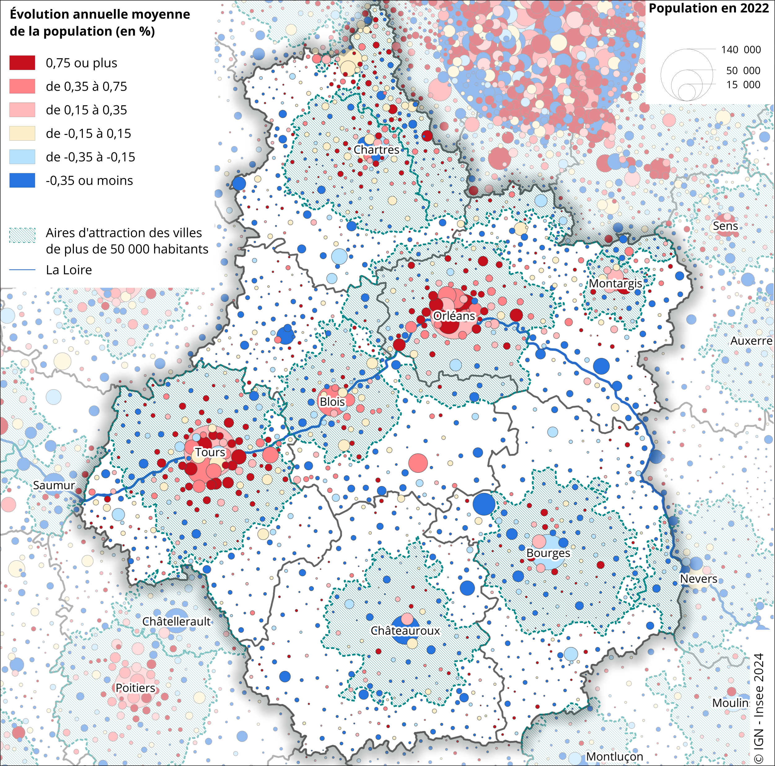 Plus de 70 % de la population régionale réside dans l’une des huit aires d’attraction des villes de plus de 50 000 habitants. Entre 2016 et 2022, la population s’accroît globalement de +0,2 % dans ces aires (particulièrement dans celles d’Orléans et de Tours). Les pôles voient leur population augmenter à un rythme légèrement supérieur (+0,3 % par an), uniquement en raison de l’accroissement naturel. Dans les couronnes, le solde naturel et le solde migratoire contribuent autant à la hausse de la population (+0,1 %). Néanmoins, la croissance de la population dans les couronnes est moins importante qu’à la période précédente (+0,2 % entre 2016 et 2022, contre +0,5 % entre 2011 et 2016). Dans les aires d’attraction des villes de 50 000 à 200 000 habitants dont le pôle est dans la région, la population dans les couronnes n’augmente plus entre 2016 et 2022 (contre +0,4 % entre 2011 et 2016). Cela correspond à une baisse de 160 habitants par an en moyenne, contre une hausse annuelle de 1 530 habitants à la période précédente.