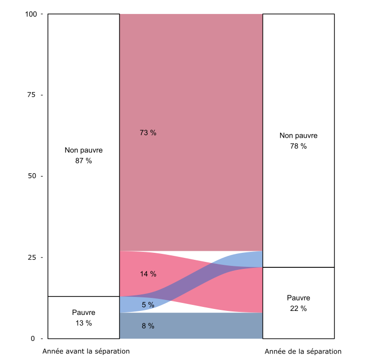- Lecture : L’année avant la séparation, 13 % des individus sont pauvres, contre 22 % l’année d’après. 8 % des individus étaient déjà pauvres avant la séparation et le restent.