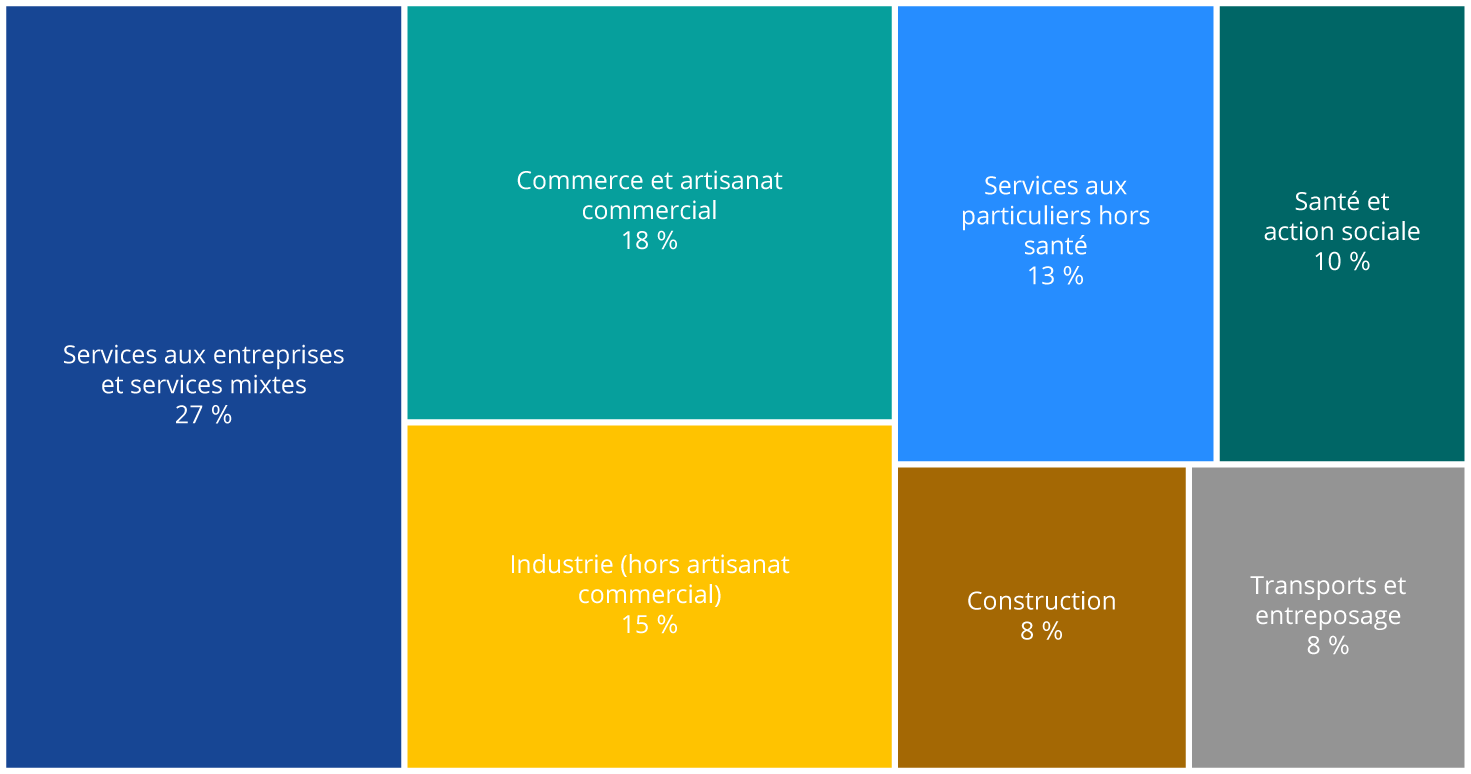 Services aux entreprises et services mixtes : ce secteur rassemble des services s’adressant principalement aux entreprises (codes M et N de la NAF), et des services dits « mixtes », qui s’adressent aussi bien aux entreprises qu’aux particuliers (codes J, K, L). Ils regroupent les activités spécialisées, scientifiques et techniques (activités juridiques, comptables, conseil de gestion, architecture, ingénierie et autres activités spécialisées telles que publicité, design, photographie, traduction, etc.), les services administratifs et de soutien (nettoyage, sécurité, location de véhicules et équipements divers, photocopie et autres services de bureau), l’information et la communication (activités de programmation et conseil en informatique notamment, activités audiovisuelles, édition, services d’information), les activités financières et d’assurance et les activités immobilières.
