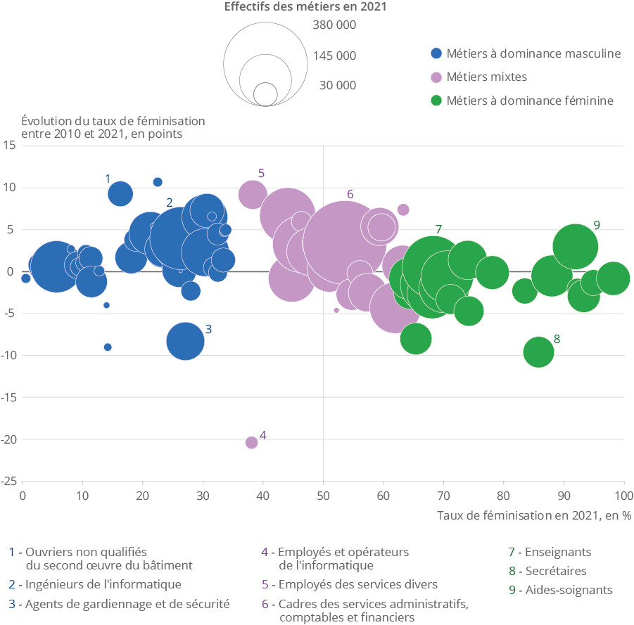 | Famille professionnelle | Type de métier | Taux de féminisation en 2021 (en %) | Évolution du taux de féminisation entre 2010 et 2021 (en points) | Effectifs en 2021 |