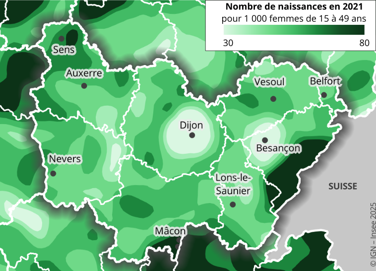 À âge donné, la propension des femmes à avoir des enfants diffère selon les territoires. Elle est plus forte dans les zones les plus attractives pour les jeunes actifs, en particulier pour les 25-34 ans. La proximité d’emplois bien rémunérés constitue un facteur important. Ainsi, le taux de fécondité est plus élevé dans la bande frontalière avec la Suisse et dans les territoires aux franges de la région comme le Sénonais et le Mâconnais (figure 3). À l’inverse, au cœur des deux grandes agglomérations de la région, la fécondité est globalement plus faible : la part de jeunes femmes en études est importante, or ces populations font généralement moins d’enfants et à des âges plus élevés. La fécondité des femmes plus âgées y demeure l’une des plus importantes.