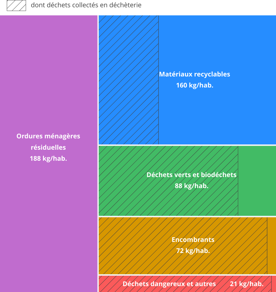 | Type de déchets | Collecte | Part de déchets collectés en déchèterie |