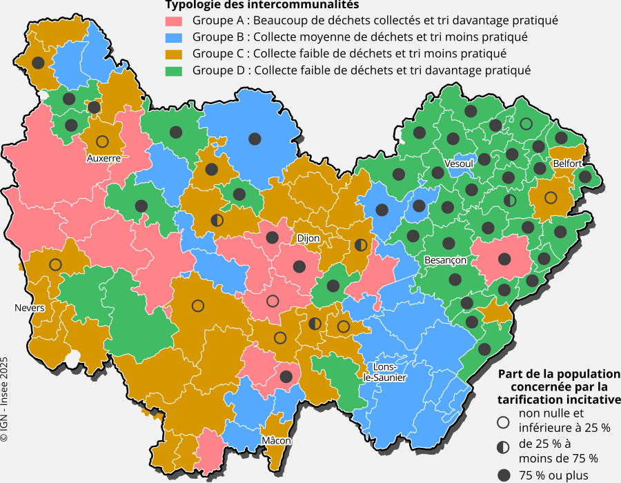 Il s’avère que pratiquement toute la population de ces intercommunalités est soumise à la tarification incitative (encadré). Elle encourage les habitants à modifier leurs comportements et modes de consommation en diminuant leur quantité globale de déchets et en augmentant leur taux de tri. En particulier, Besançon est depuis 2012 la ville la plus peuplée de France à utiliser la tarification incitative. La collecte des déchets y est 20 % inférieure à la moyenne régionale, tant pour les ordures ménagères résiduelles que pour les déchets triés.