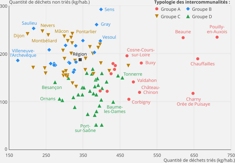 En 2021, 1,5 million de tonnes de déchets ménagers et assimilés, hors déblais et gravats, sont collectés en Bourgogne-Franche-Comté. Ils représentent 529 kg par habitant, moins qu’en France métropolitaine. Dans la région, 64 % des déchets sont recueillis par la collecte sélective et les déchèteries, et 57 % sont envoyés à la valorisation, permettant ainsi de limiter l’impact sur l’environnement. Les 113 intercommunalités de la région peuvent être réparties en quatre groupes selon les quantités de déchets collectés par habitant et le taux de tri réalisé par les ménages. En particulier, en Haute-Saône et dans le Doubs, la collecte de déchets apparaît modérée et le tri plus pratiqué, en raison notamment de la mise en place d’une tarification incitative.