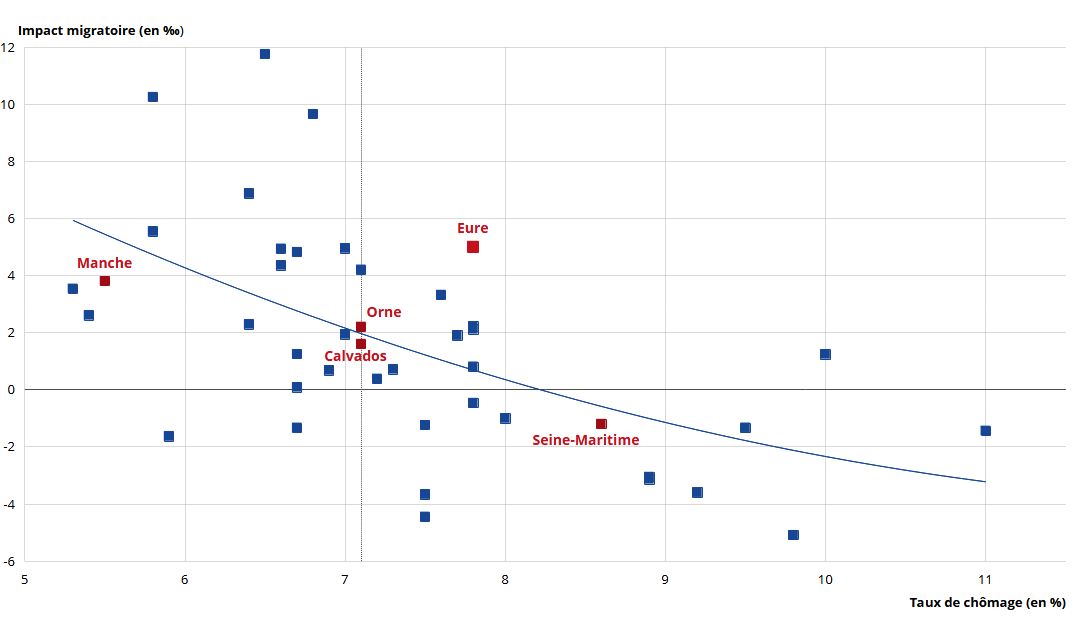 - Lecture : En 2021, le taux de chômage dans la Manche s’élève à 5,5% et l’impact migratoire est de 3,8‰. Le département se situe dans la tendance des départements du nord de la France d’une corrélation négative entre ces deux variables.