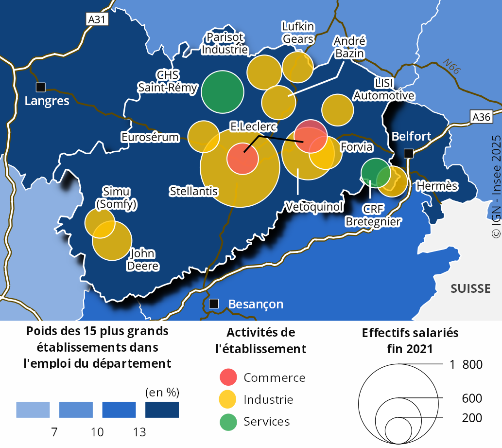 Les établissements des grandes entreprises perdent 10 % de leurs effectifs. La majorité de ces pertes d’emploi concerne Stellantis à Vesoul, où le site spécialisé dans les pièces détachées automobiles perd 500 emplois en quatre ans, en lien avec le repli de la filière en France. En outre, dans l’industrie du bois, les établissements du groupe Parisot à Saint-Loup-sur-Semouse connaissent des difficultés depuis plusieurs années.