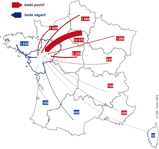 - Lecture : En 2021, le solde entre le nombre de Franciliens arrivés dans les Pays de la Loire et le nombre de Ligériens partis en Île-de-France est de +12 570 habitants.
