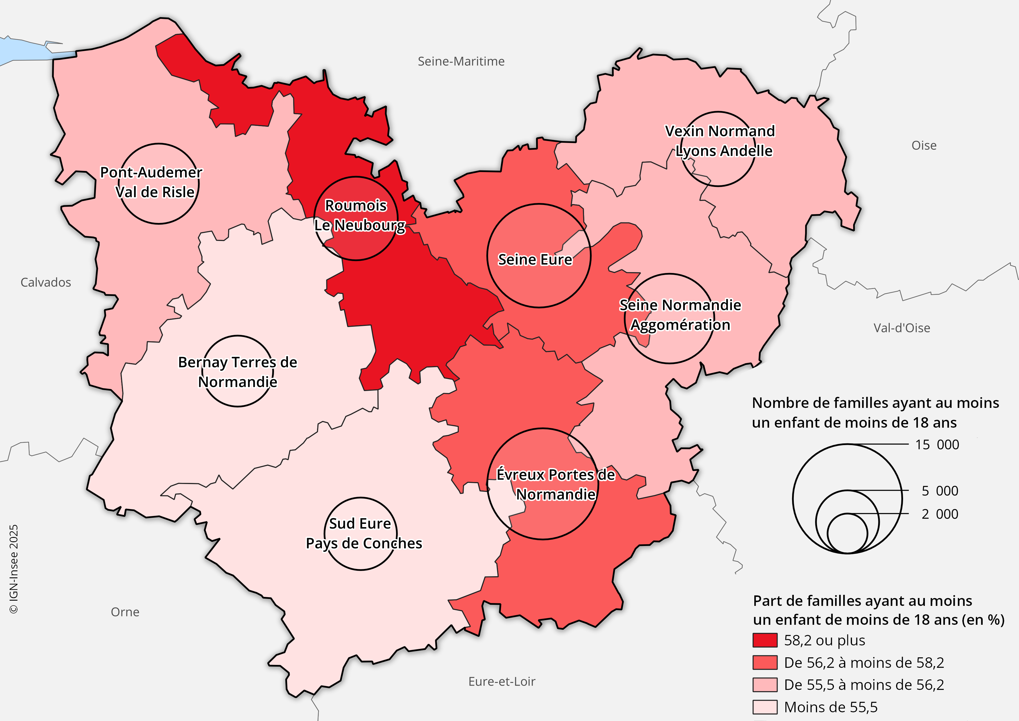 Au sein du département, la part de familles avec au moins un enfant mineur est plus élevée dans les territoires (pour comprendre) du Roumois – Le Neubourg (58,7 % ; figure 1), d’Évreux Portes de Normandie et de Seine Eure (58,2 % pour ces deux derniers territoires). À l’inverse, cette part est plus faible dans le sud-ouest du département, comme à Bernay Terres de Normandie où les familles avec enfants mineurs représentent 54,8 % de l’ensemble des familles ; une valeur qui reste néanmoins similaire à celle de l’ensemble de la région.