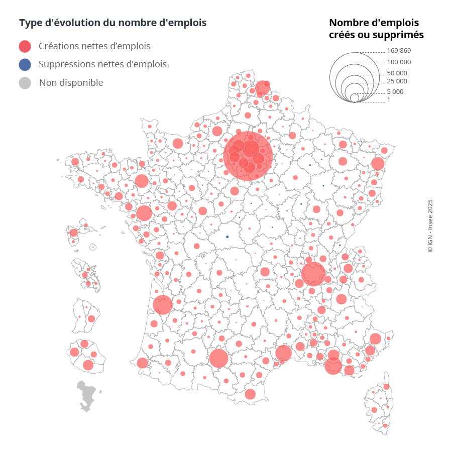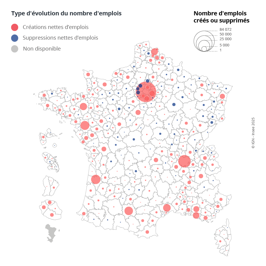 Les créations d’emplois sont le résultat d’un solde positif entre les emplois créés et les emplois supprimés au niveau des établissements. À l’inverse, les suppressions d’emplois sont le résultat d’un solde négatif.