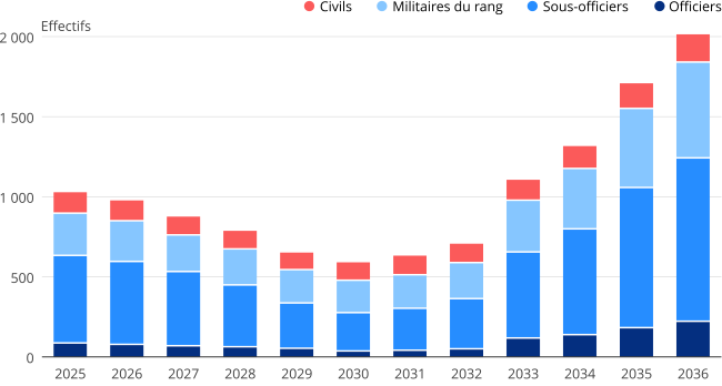 graphiqueFigure 3 – Projection des effectifs entre 2025 et 2036 selon le grade