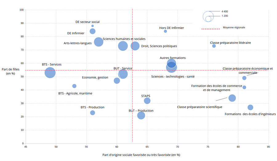 | Disciplines | Part origine sociale favorisée ou très favorisée (%) | Part de filles (%) | Nombre d'élèves |