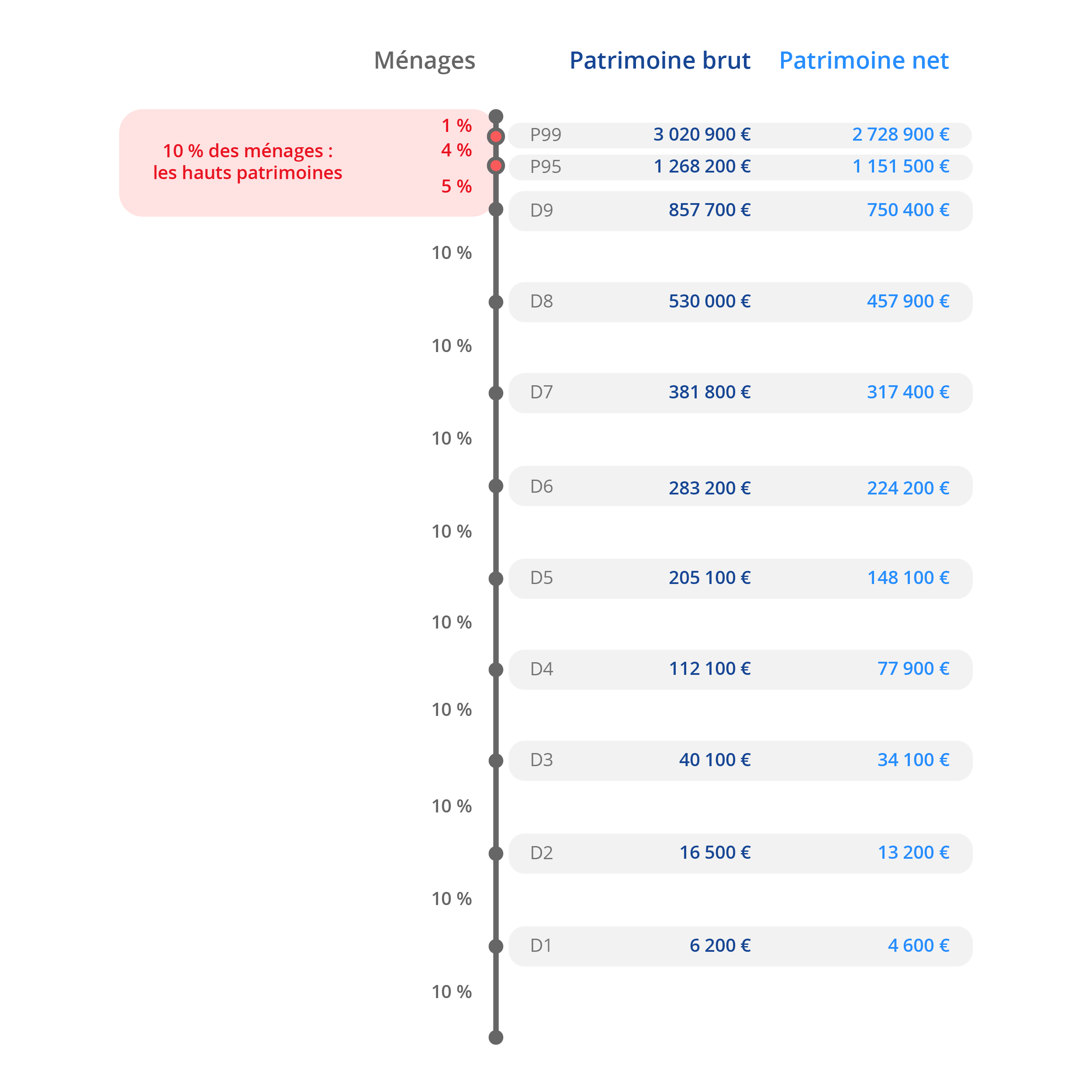 - Lecture : Début 2024, 10 % des ménages ont un patrimoine brut supérieur à 857 700 euros (9e décile ou D9). Par ailleurs, 10 % des ménages ont un patrimoine net supérieur à 750 400 euros, une fois déduits leurs éventuels emprunts en cours.