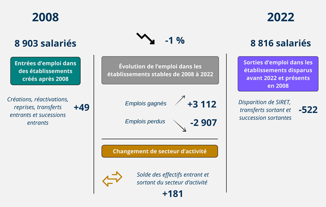 | Évolution de l’emploi dans les établissements stables de 2008 à 2022 | Emplois gagnés | 3 112 |