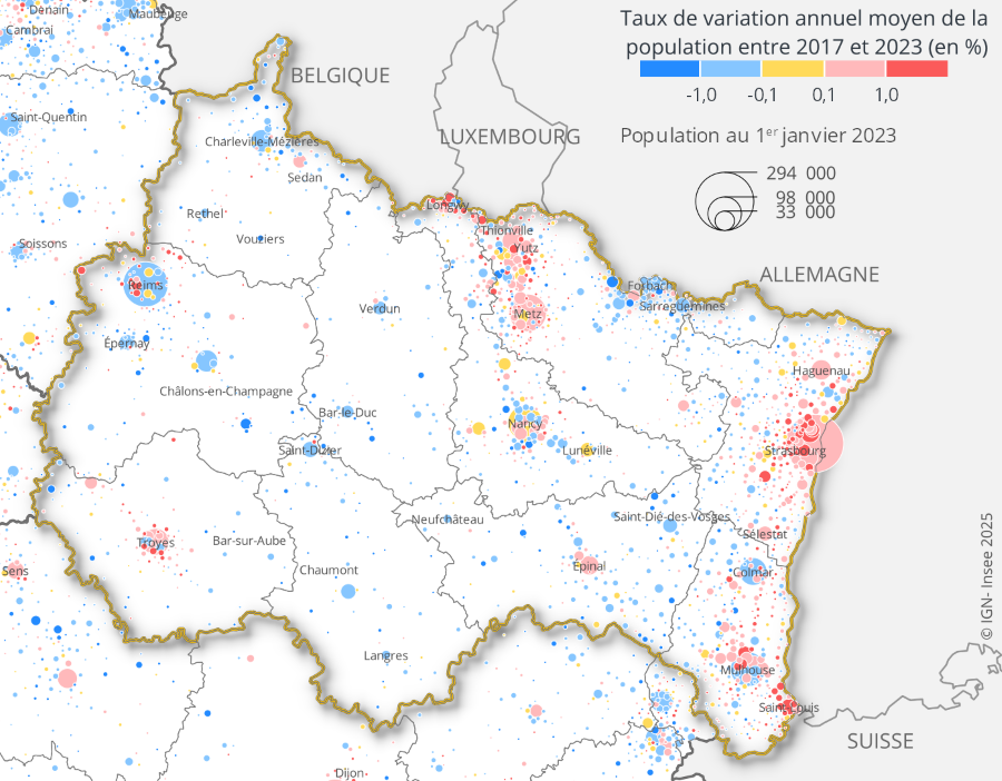 Les communes de plus de 15 000 habitants représentent 28 % de la population du Grand Est, soit près de trois habitants sur dix. Entre 2017 et 2023, sur ces 34 communes, 16 sont en croissance démographique, 3 stagnent et 15 ont une population qui diminue.