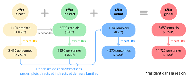 Emploi induit : nombre d’emplois générés par la consommation courante (alimentation, habillement, logement, services, etc.) des familles des emplois directs et indirects.