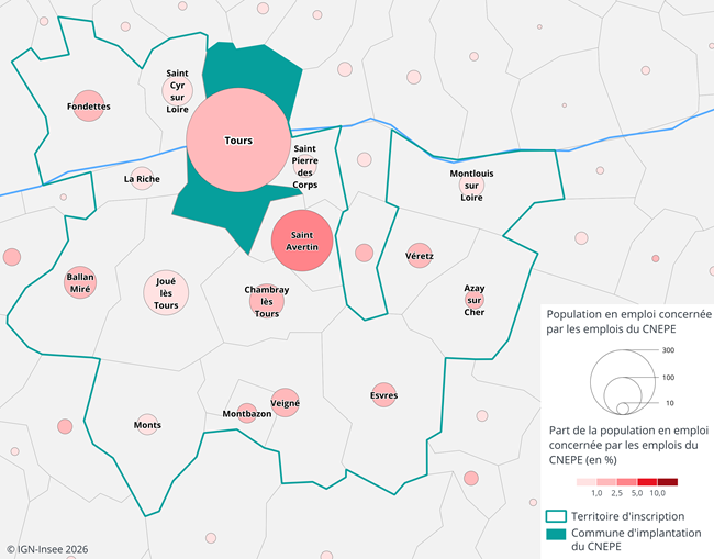 Le territoire d’inscription comprend toutes les communes du pôle de l’aire d’attraction de Tours. En prenant en compte l’ensemble des activités liées ou non au CNEPE, ce pôle compte plus de 140 personnes qui y travaillent pour 100 actifs occupés qui y résident, et porte l’essentiel de la dynamique de l’Indre‑et‑Loire en termes de population et d’emploi. Au regard de la diversification des activités présentes dans ce territoire, la part de la population en emploi concernée par l’activité du CNEPE ne dépasse les 2 % que dans trois communes, notamment à Saint‑Avertin (4,4 %). Cependant, les effectifs concernés peuvent être conséquents, comme à Tours où 780 personnes occupent un emploi lié au CNEPE, ou encore Saint‑Avertin (270 emplois) et Joué‑lès‑Tours (140).