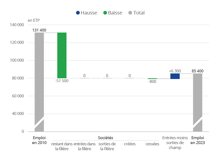 Si l’enquête de 2023 porte sur l’ensemble des activités de la filière automobile (y compris celles des secteurs non industriels), celle de 2010 ne porte que sur des secteurs manufacturiers. Par ailleurs, l’enquête de 2010 est exhaustive pour les sociétés de 20 salariés ou plus, alors que celle de 2023 l’est au‑delà d’un seuil spécifique à chaque secteur (0, 5, 10, 50 ou 100 salariés selon le code APE de la société) [Camille et al., 2026]. Enfin, quelques secteurs manufacturiers faisaient partie du champ de l’enquête en 2010, mais pas en 2023. Pour que les évolutions ne soient pas biaisées par ces différences de contour des enquêtes, les analyses sont restreintes aux sociétés des secteurs manufacturiers, de taille suffisante pour appartenir au champ de chacune des deux enquêtes, y compris celles cessées après 2010 et celles créées après 2010. Ainsi 206 sociétés, comptabilisant 35 600 ETP, faisaient partie du champ de l’enquête en 2010 mais pas de celle de 2023 (notamment parce qu’elles ont changé de secteur, ou parce que leur effectif salarié est sous le seuil d’interrogation de l’enquête de 2023) ; réciproquement, 349 sociétés manufacturières, comptabilisant 37 500 ETP, qui ont été interrogées en 2023 ne faisaient pas partie du champ de l’enquête de 2010. En matière d’emploi, ces entrées et sorties de champ se compensent globalement dans l’évolution des sociétés industrielles de la filière. Certaines sociétés industrielles dans la filière en 2010 peuvent continuer à fournir l’industrie automobile, mais en ayant changé d’activité principale (et inversement, des sociétés de service ayant une activité industrielle destinée à l’industrie automobile en 2010 sont devenues des sociétés industrielles en 2023). Ces sociétés ne sont pas dans le champ de cette analyse.